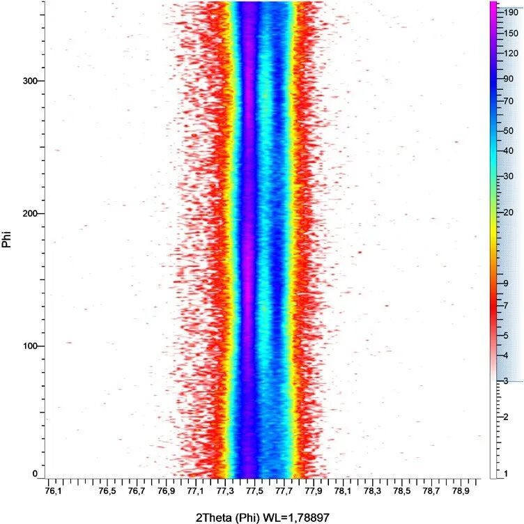 ▲圖3. DIFFRAC.EVA軟件二維展示使用Co特征X射線測量的軋制鋁板樣品的Phi-1D掃描圖譜